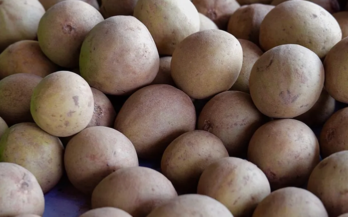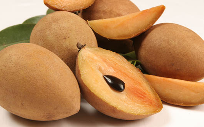 Chikoo has brown fuzzy skin and is more oval-shaped than its Central American cousins, though some develop pointed ends. The skin is inedible, but serves a purpose as a kind of bowl for the sweet flesh. The flesh is off-white to a yellowish brown color and has a soft and juicy texture.