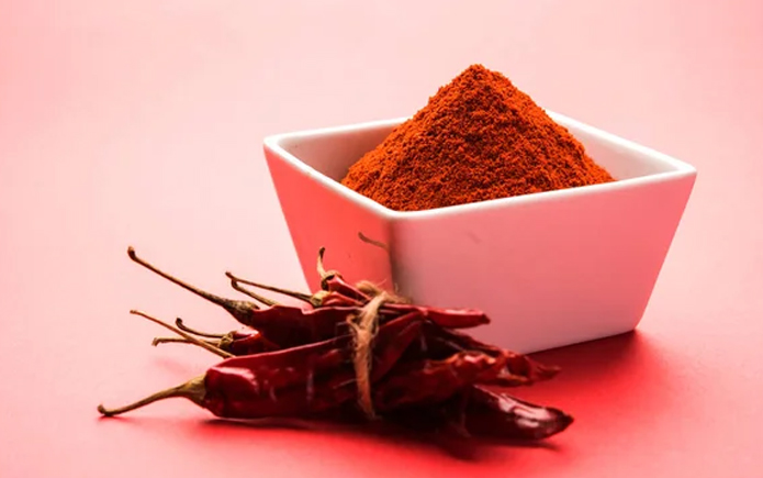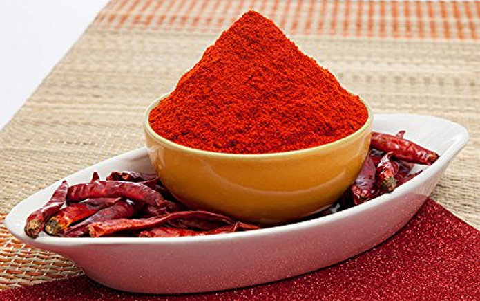 Red Chili Powder is a red-colored blend of powdered spices. While it contains some cayenne pepper for heat, it also has spices such as cumin, garlic powder, oregano, and paprika intended to lend the flavors expected in chili con carne. The ratio is one part cayenne to seven parts other spices, depending on the blend.